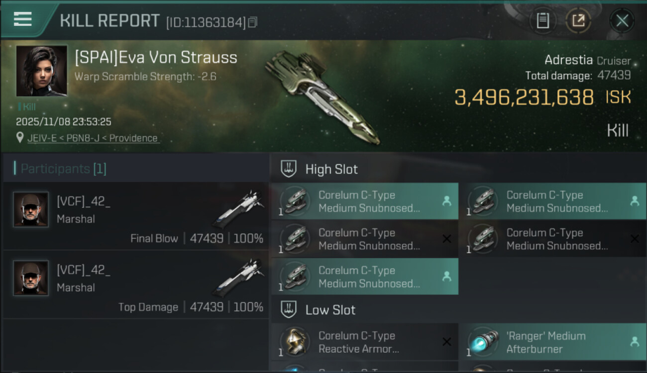 | K. corp | Killer | K. ship | K. class | V. corp | Victim | V. ship | V. class | System | Region | Isk | Date | Killmail |