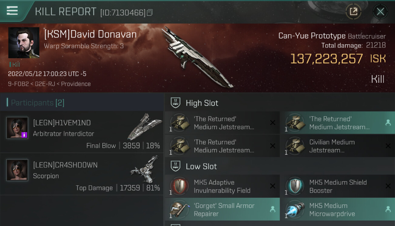 1 killmails for 137,223,257 total isk (csv)